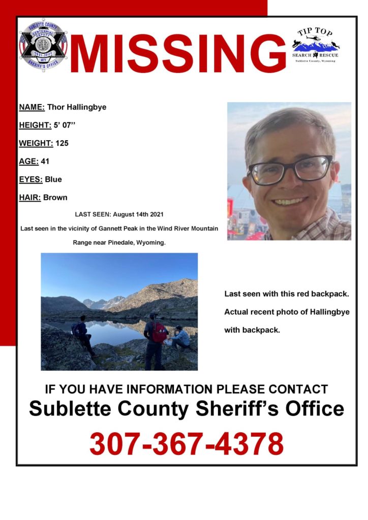 Thor Hallingbye was last seen with a red backpack in the vicinity of Gannett Peak in the Wind River Mountain Range on Saturday, August 14.