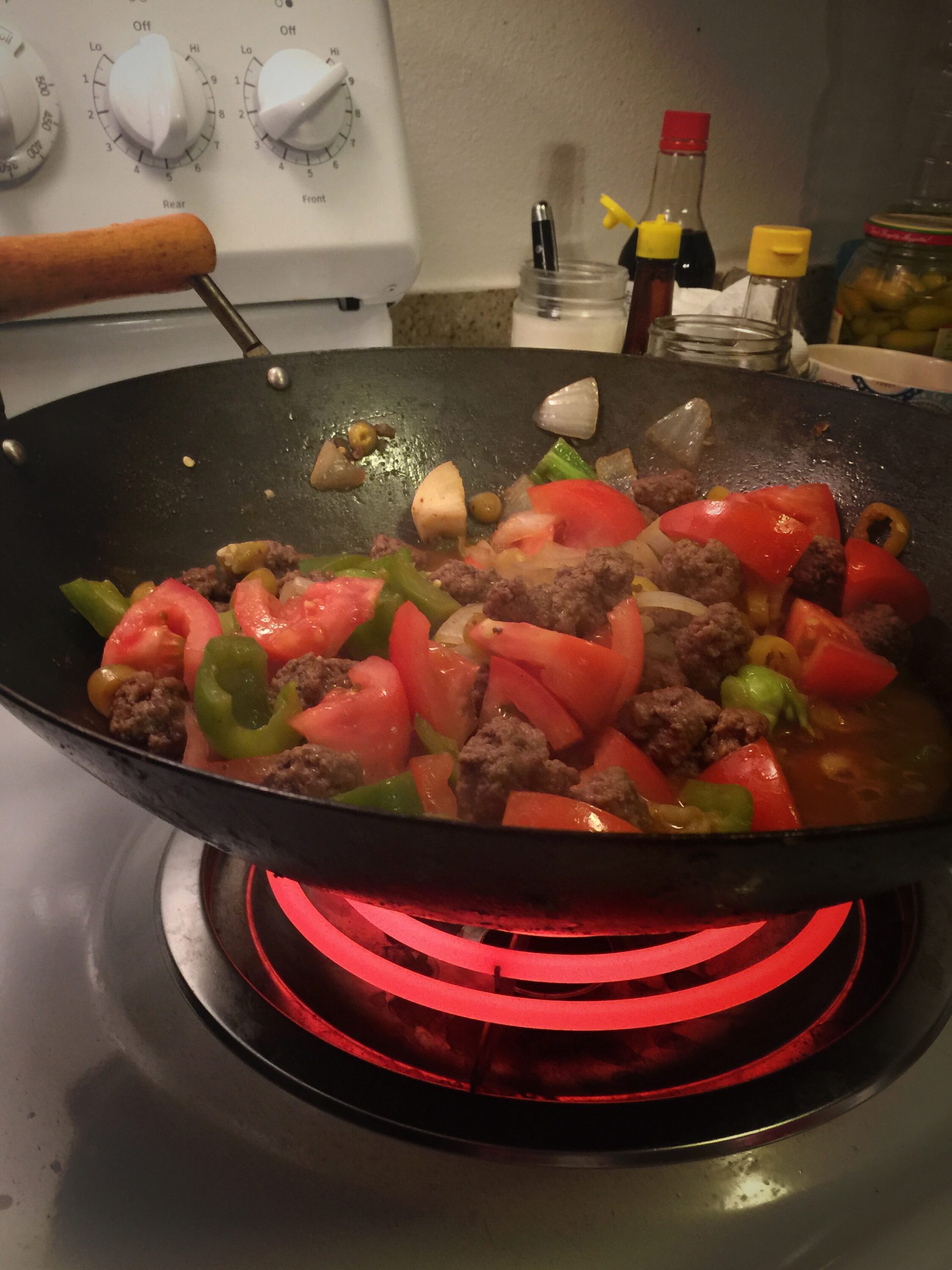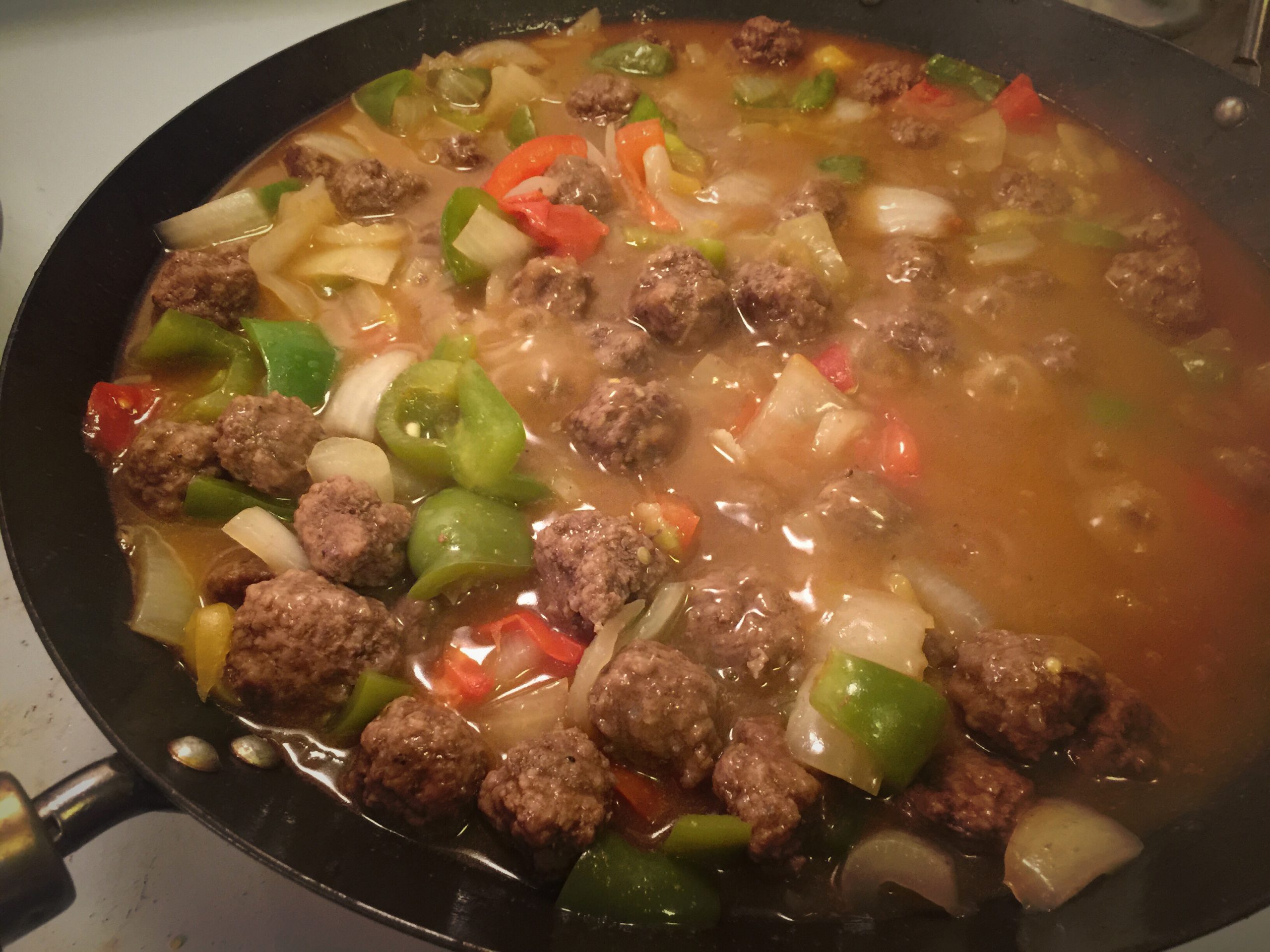 Once the meatballs are browned, throw in the onions and peppers. Don’t add the tomatoes yet! Let it simmer, stirring occasionally. Once the onions and peppers have cooked in with the meat for a while, add a cup of water.