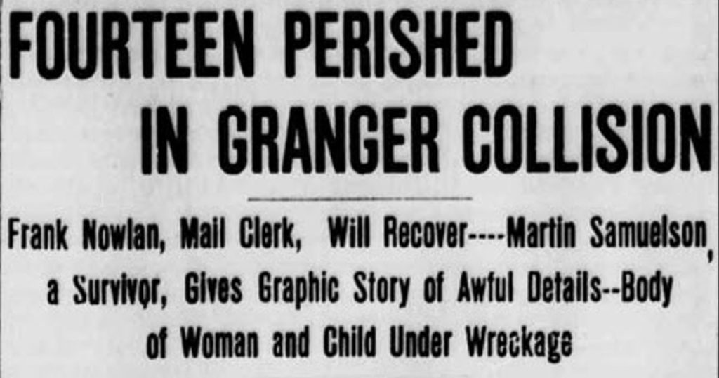 At about 11:59 PM on November 11, 1904, a westbound passenger train, Passenger Number 3, collided head-on with an eastbound freight, No 1661, some four miles east of Granger