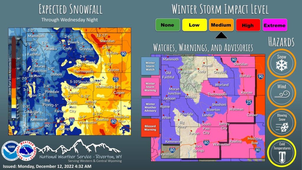 The winter storm warning goes into effect today at 5 p.m. and runs through Wednesday, December 14, at 6 a.m. East Sweetwater County can expect to see 4-7 inches of snow with wind gusts as high as 40 mph.