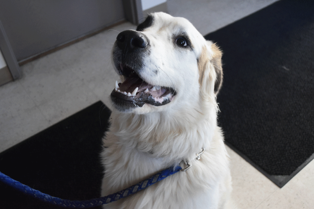 Hello! I’m Brutus, a 7-month-old male Pyrenees and Saint Bernard mix. I’m sure you could tell from my breed that, well, I’m a big boy. I seem to have quite a few Pyrenees traits and would make an excellent guard dog. But that doesn’t mean I’m not super sweet and friendly! I’ll alert my family of guests, and then greet them with my big smile. I’m just a happy and gentle giant. I would do great with a big yard with lots of room to wander around. I’m so excited to meet you!
