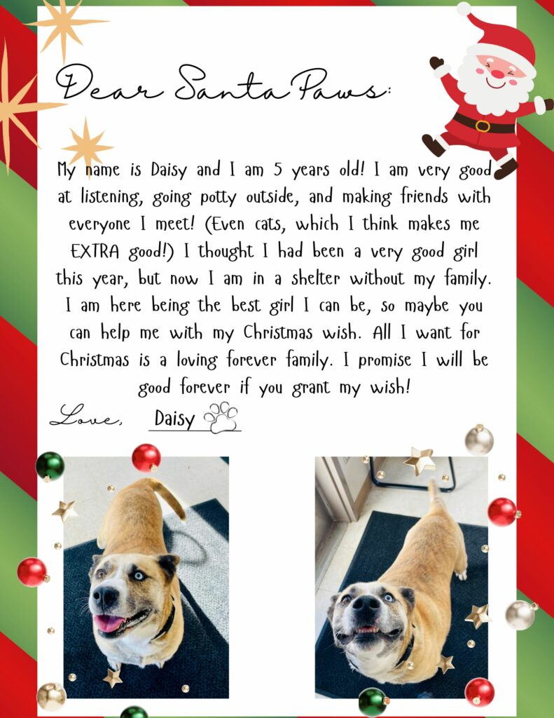 Hello! I’m Daisy, a 5-year-old female Pit Bull Terrier and Husky mix. All I want for Christmas is a family who loves me! I’m the sweetest girl you’ll ever meet, and I’ll be your best friend for life! I get along with everyone, and I mean everyone, and I’ve never met a stranger in my life! I’m great with kids, other dogs, and even cats—I’m just THAT lovable! I listen well, sit very nicely, and have great manners all around. I’m also super gentle and chill! I ended up here at the shelter because my human went to college and her family said they did not have enough time for me, so they brought me here. I really can’t wait to find a family who will be as devoted and loving as I am. And I really hope it’s you! I’m so excited to meet you! Read my letter to Santa Paws below to learn a little more about me ❤️ Hopefully I can spend Christmas in my new home with my furever family!