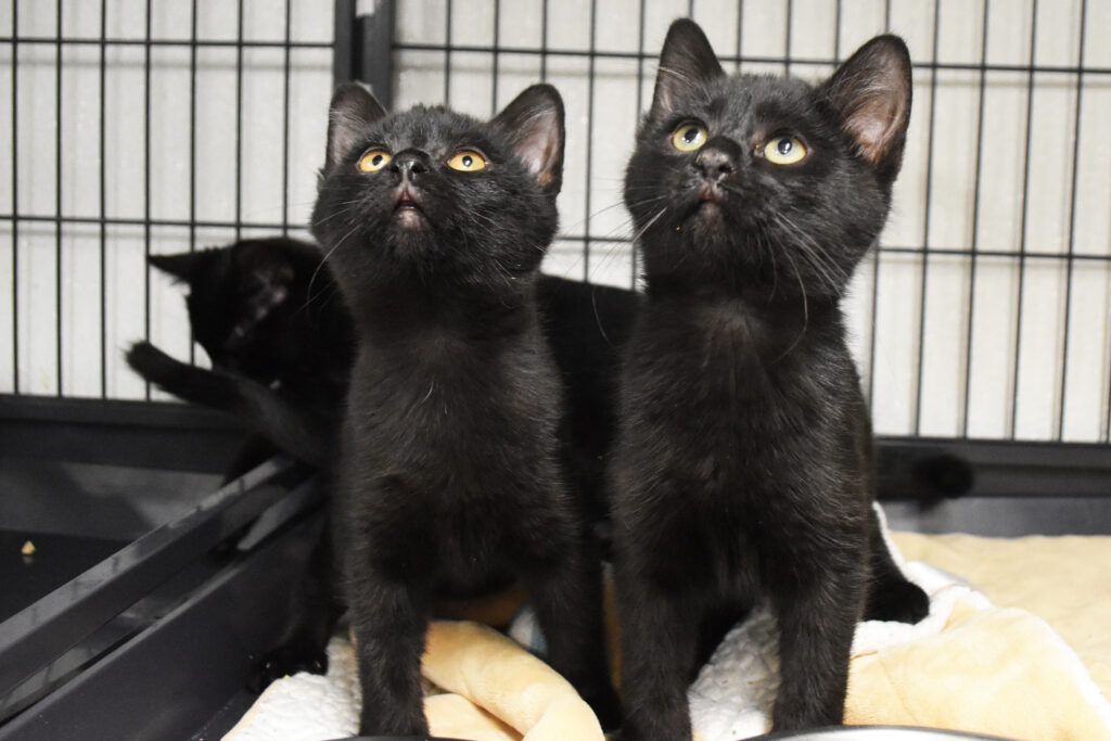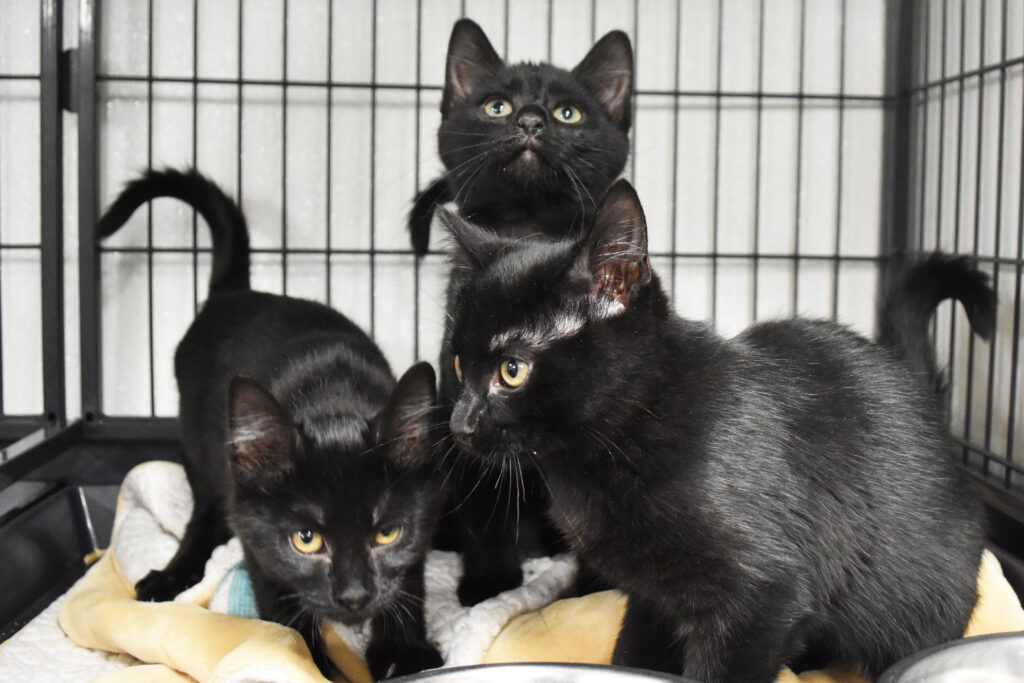 Hi! We’re Archer (boy), Blaze (boy), and Mrs. White (girl), three 13-week-old kittens. We came into the shelter as strays with two other siblings. We were found with our mom on Elk Street near the gorilla statue, and now we’re here! We’re curious kittens who love to play hard, and then sleep hard. If you’re looking for some cute kitties to raise, you found us! We can’t wait to see you soon!