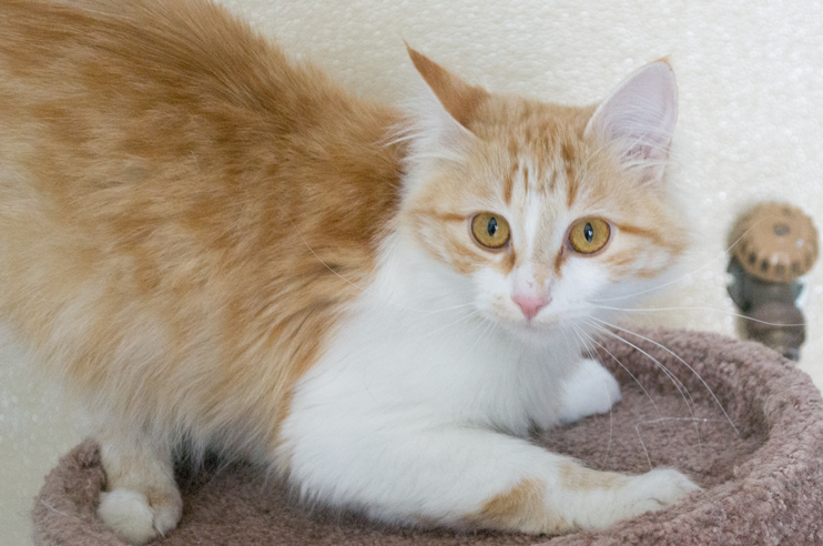 Hey there! I’m Ginger, a female long-haired kitten. I came in as a stray so I’m a bit of a mystery, but I think I’m around 6 months old. I’m super cute, obviously, and I’m very sweet. I’m also a playful girl, which makes me the perfect buddy for both cuddling and playing. You can’t resist my cute face, can you?