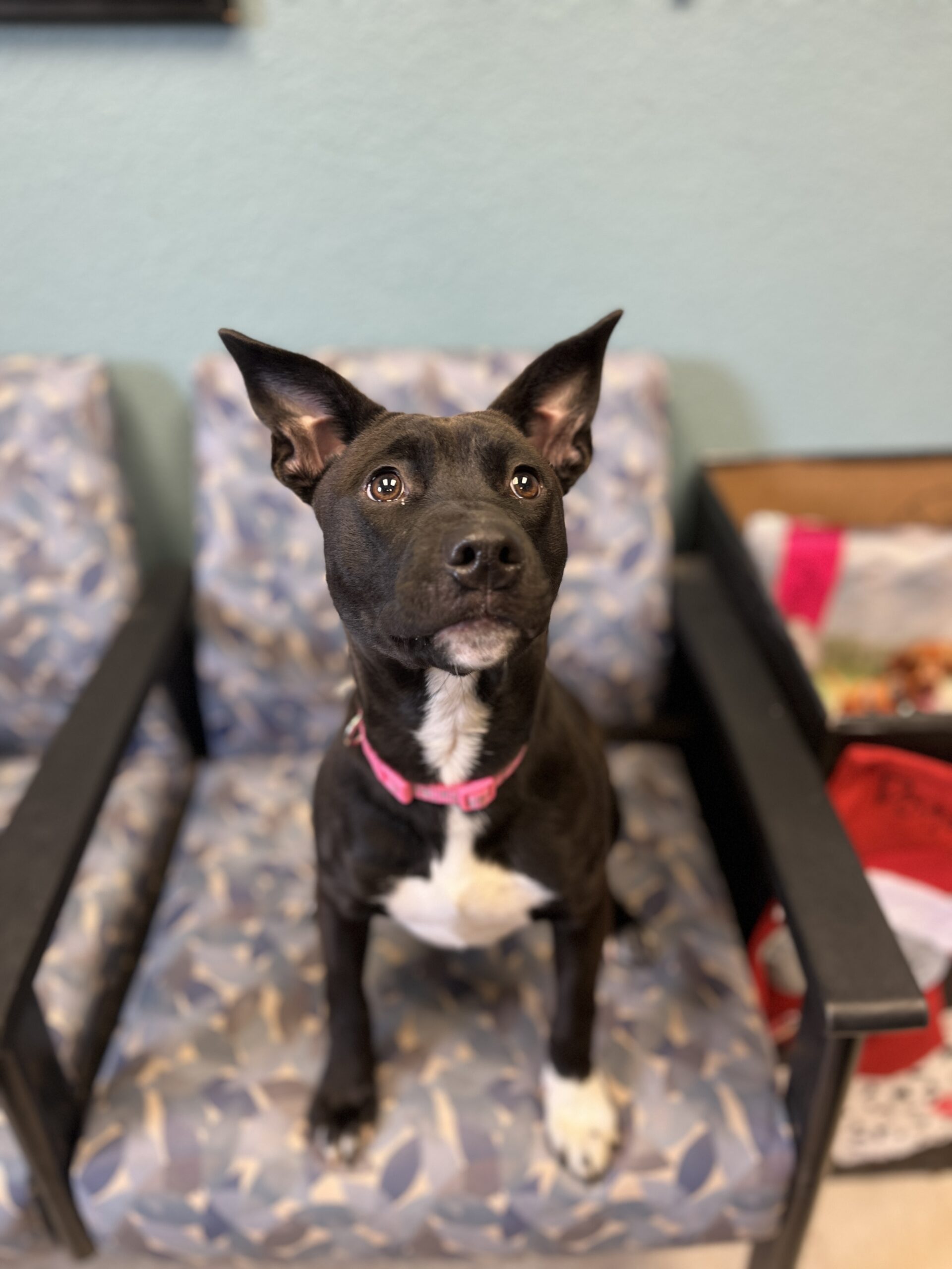 Hey there! I’m Roxy, a 19 week old girl ready for new adventures. I’m still a puppy so I will need some training, but I do know how to sit for a treat! I just came to the shelter recently so not to much is known about me yet. They do know that I do ok with other dogs.