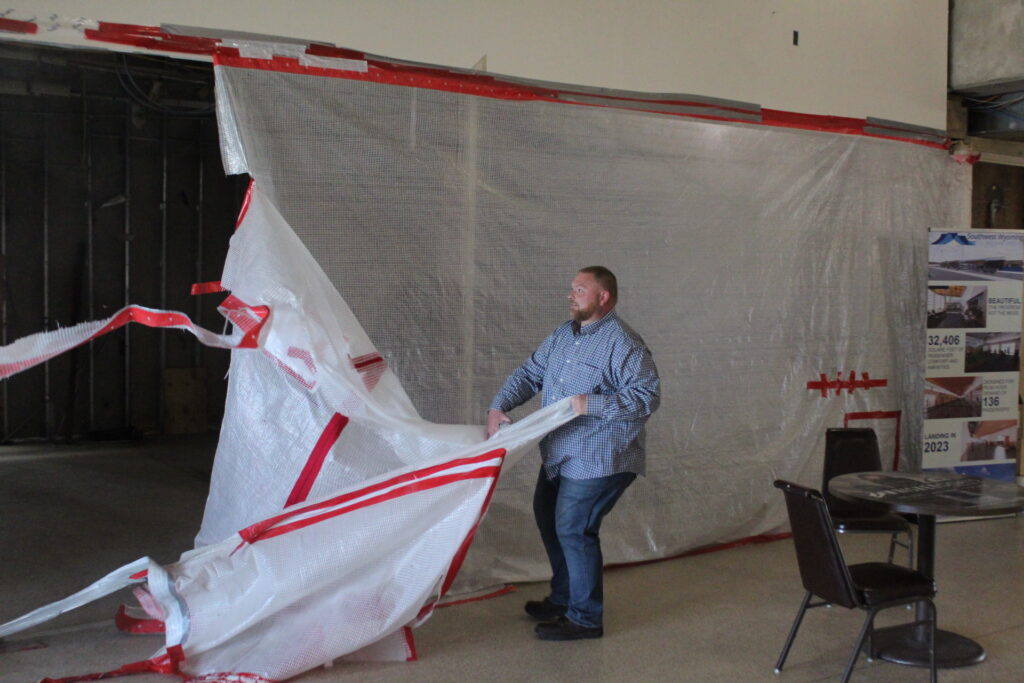 As work to prepare the terminal for a full-scale construction project commenced, Brubaker immediately targeted a semitransparent sheet of plastic hanging near the rental car desk and tore it down by hand. The plastic covered an area that had already had some work done by the previous contractor and was a divider between the then area still accessible to the public and the closed off work space. Brubaker said the plastic sheet irritated him during the past two years and criticized the logic that led to it being hung up.