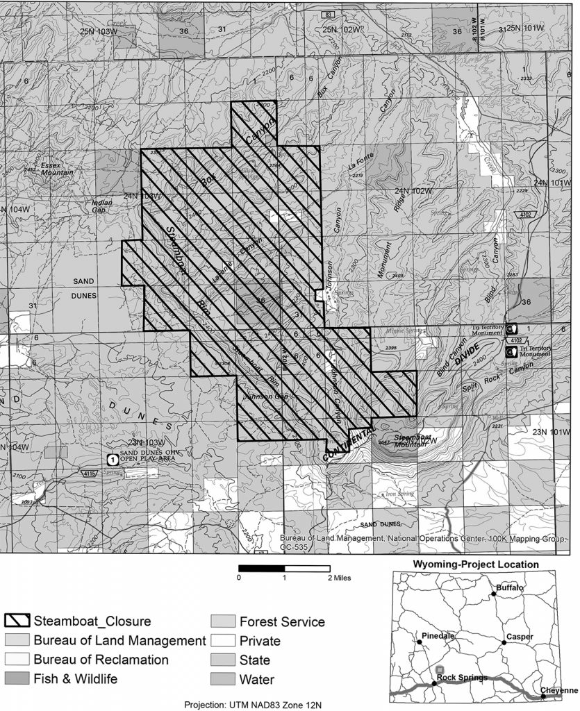 The Steamboat Mountain area is located northeast of Rock Springs. Signs will be posted to notify motorists of the temporary closure. BLM law enforcement rangers and other employees will patrol the area to inform the public and enforce the seasonal vehicle restriction.