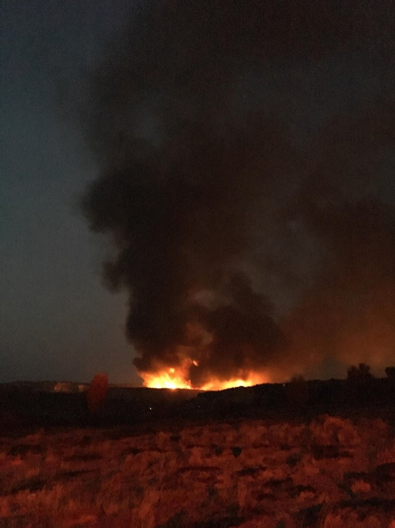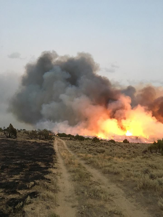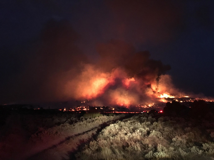 UPDATE– At 9:45 pm, the fire is estimated at approximately 3000 acres. It is burning on BLM and private land.