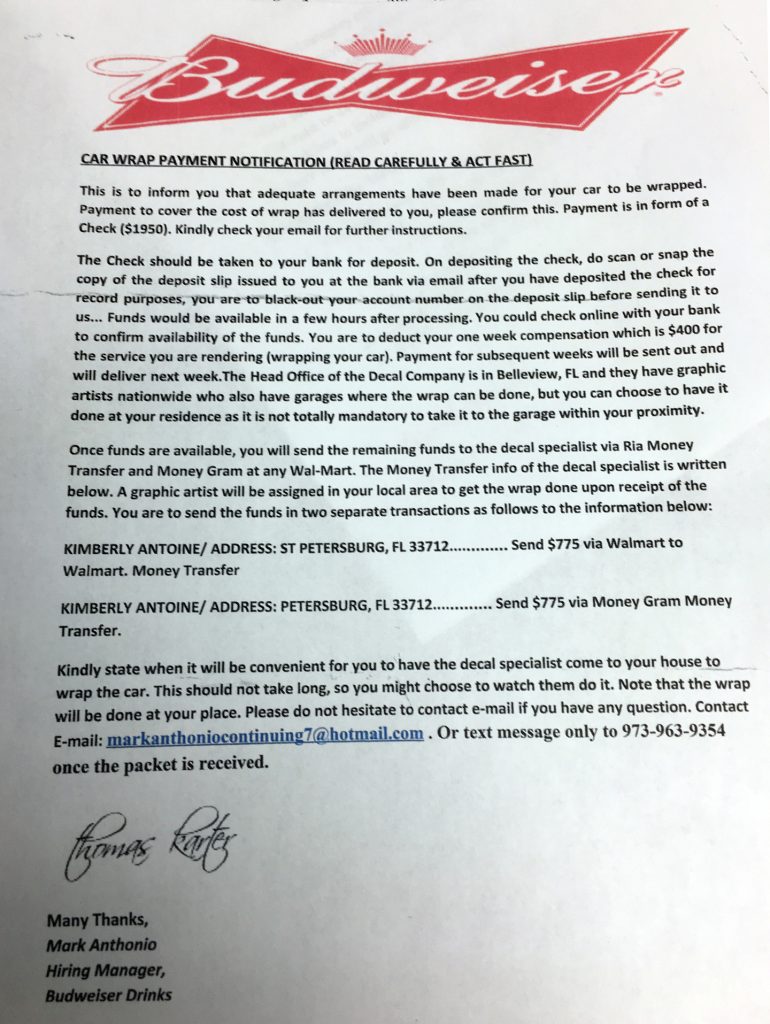 Next, the letter directs that you will soon receive $400 (or more) and have your car wrapped at no charge. However, you must first wire two payments of $775 to an individual in Florida in order to facilitate the arrangement.
