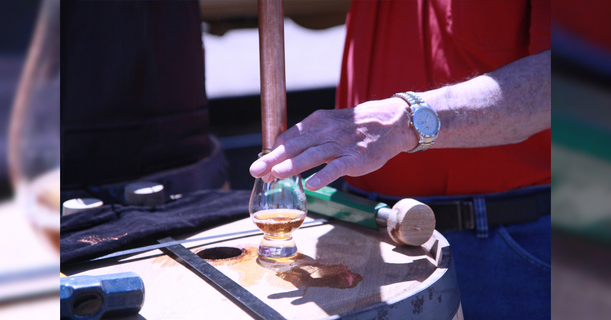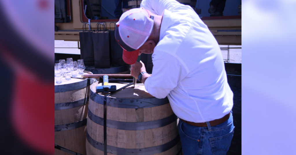 Members of the Bunning family, JBT employees and other residents joined Wason in sampling one of the new flavors from a fresh barrel tapped by Fletcher himself. Dave Bunning did the honors of pouring out small snifters of 120 proof whiskey from a copper tube that siphons the batch from the barrel .
