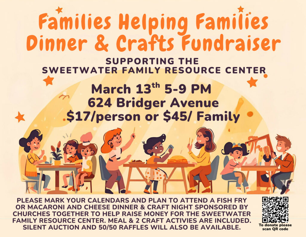 Churches Together, a network of Rock Springs congregations, will be holding a fundraiser called “Families Helping Families” on Friday, March 13th at the Catholic Parish Center in Rock Springs (624 Bridger Ave) to benefit the Sweetwater Family Resource Center. The event includes dinner (Fish and Chips by the Knights of Columbus, Mac and Cheese for those who don’t eat fish), two arts and crafts (wooden egg spinning, cross coloring, St. Patrick Day windchimes, and prayer bracelets), a silent auction, a 50/50 raffle, and musical performance by the EIO Band. Individual tickets are $17, Family tickets are $45. Please join us! If you can not attend you can still donate through the First Congregational Church via check or Paypal–mark “FHF” in the memo line of your check please!*