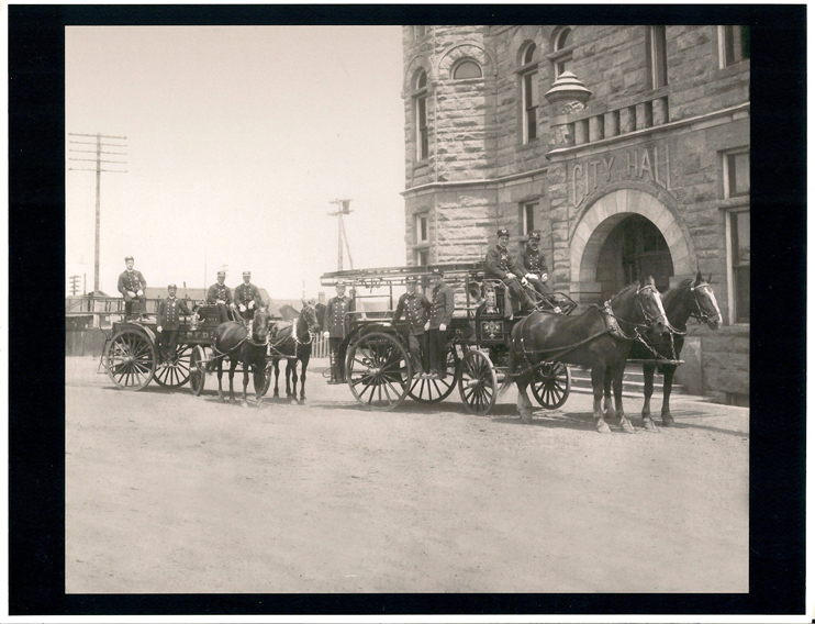 With the then brand-new city hall available, in place of its previously rented facility, the fire department moved into the city hall and stabled their two horses, “Dutch” and Mac” there.