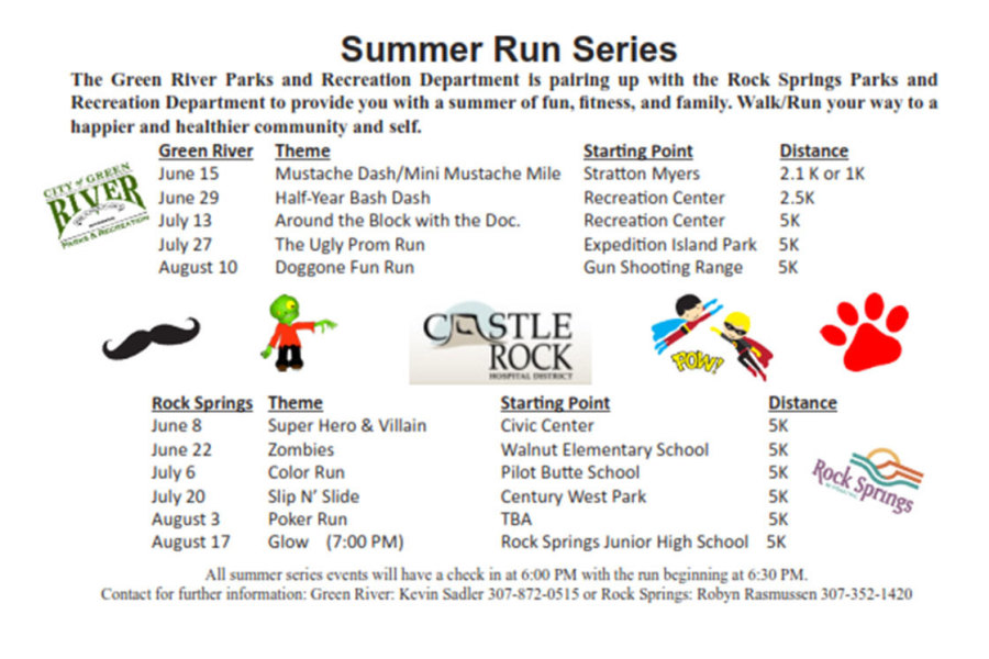 Run out of ideas of fun things to do with your family this summer? Green River and Rock Springs Parks and Rec are teaming up with Castle Rock Hospital District to bring you a fun summer run/walk series during June, July, and August. Each run is free and open to the public.