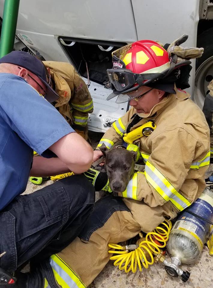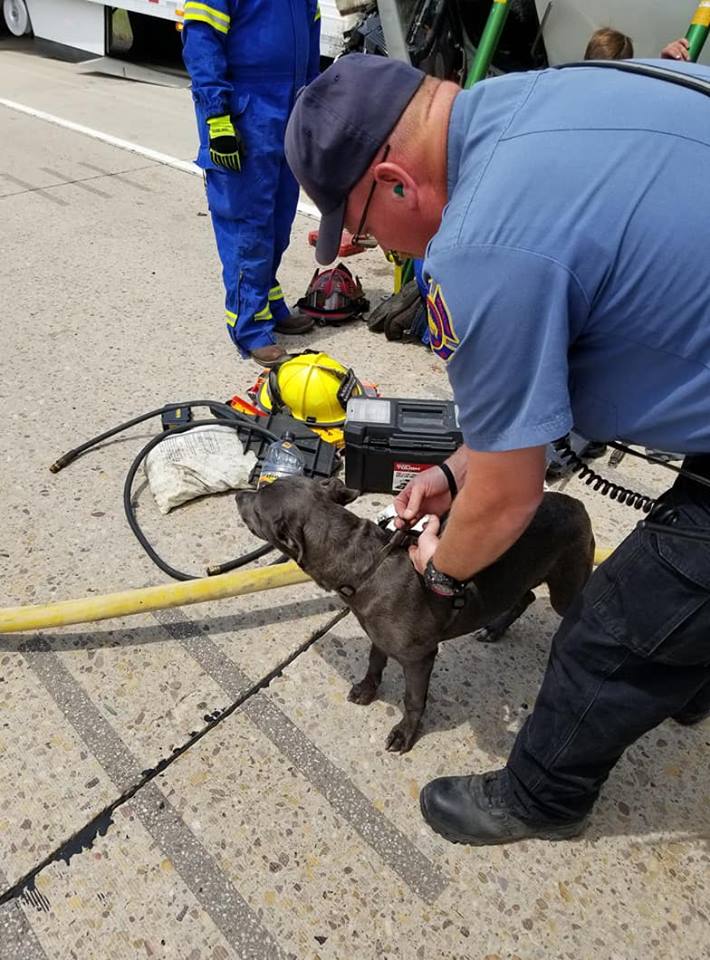 Crews worked for about 25 minutes to extricate a dog that was trapped. The dog was successfully extricated and taken to a local vet in good condition.