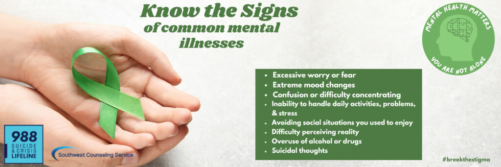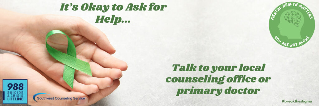 As part of Mental Health Awareness Month in May, Southwest Counseling Service wants you to know that treatment for mental illness is readily available and can dramatically improve quality of life. It can involve therapy, medication, and self-care activities. Taking the first step and seeking help is often the most difficult, but it can lead to a path of recovery and success. If you or a loved one is experiencing mental illness, there are several resources to turn to: