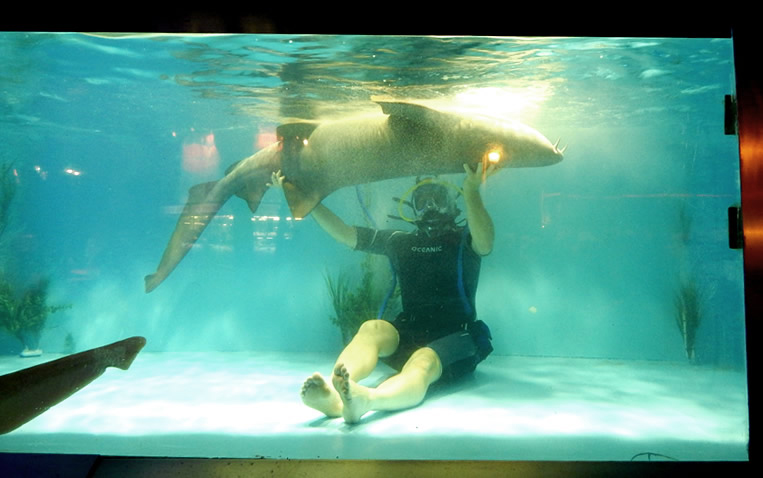 The attraction is self-contained with a canopy where fair-goers can sit in comfort and enjoy the sharks swimming in their specially designed aquarium.