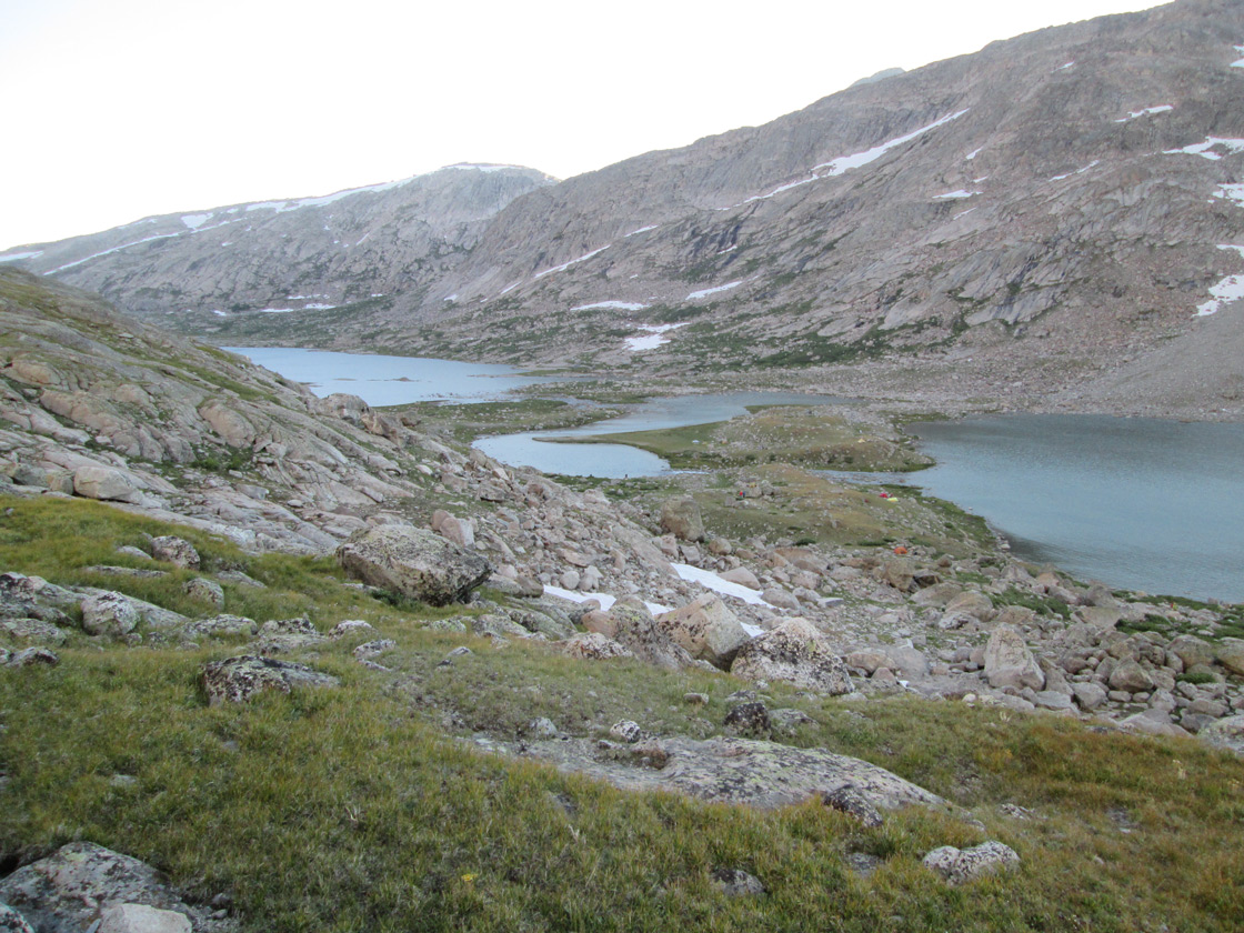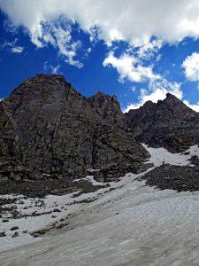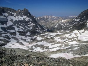 The day before I had scouted the route, to within half a mile, and six hundred feet or so below the col. There, high in a snowfield, I met a mother and daughter team from Bozeman. They had just come over the col. They pointed with their ice axes to exactly where the col was, which was reassuring to me, because its location is not obvious. There are neither signs nor a trail.