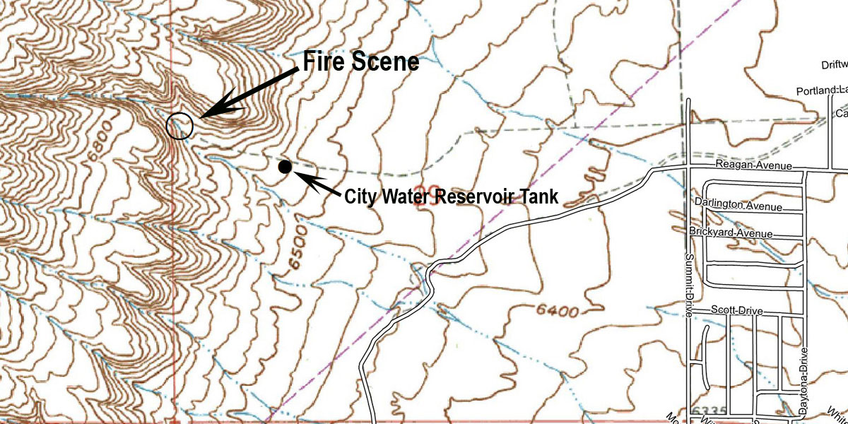 County deputies and firefighters from Sweetwater County Fire District #1 and the Rock Springs Fire Department were dispatched late Thursday afternoon to a blaze west of Rock Springs at the base of White Mountain not far from the City Water Reservoir Tank. There it was discovered that a car was afire: a badly-stuck silver 2006 Dodge. The Dodge had been extensively damaged; firefighters extinguished the fire before it consumed the vehicle further.