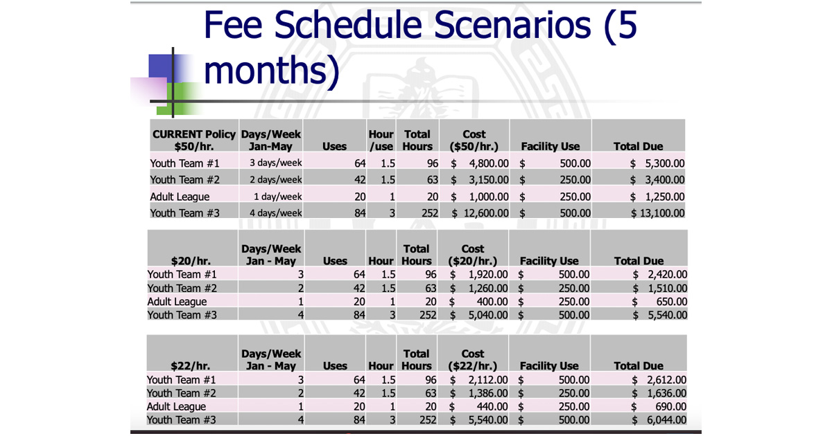While the coaches agreed that a facility fee is necessary to maintain the gyms, classrooms, pools, fields, and auditoriums, they asked the board to consider a sliding scale to accommodated teams of all sizes.