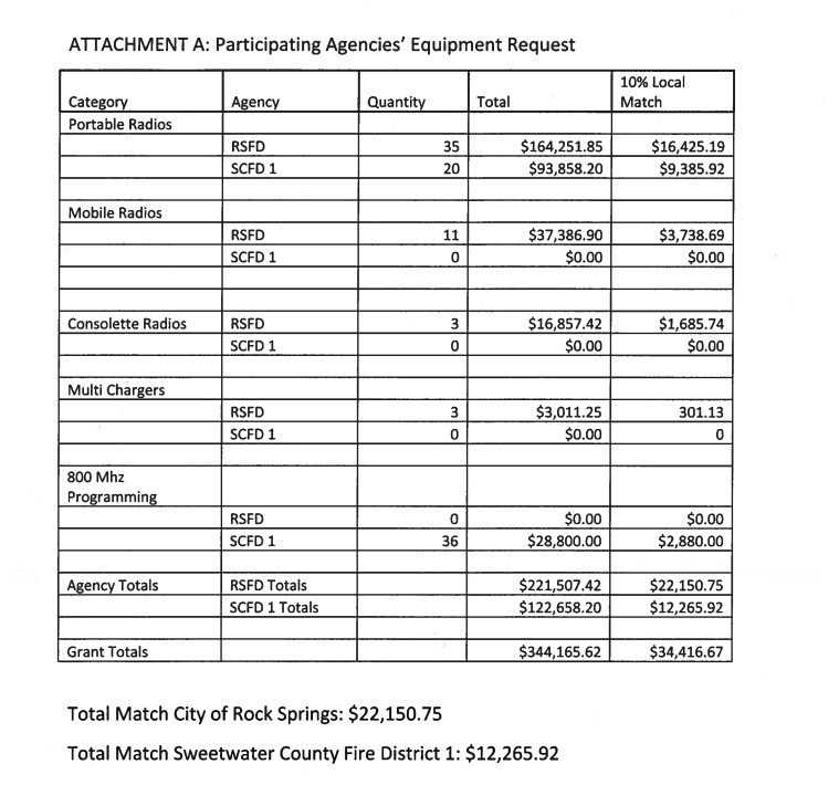 ROCK SPRINGS — The Rock Springs Fire Department (RSFD) and Sweetwater County Fire District No. 1 (District No. 1) plan to work together to obtain a nearly $345,000 grant from the Federal Assistance to Firefighters.