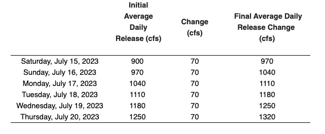 The water release will go from 900 cubic feet per second (cfs) to 1,320 cfs according to the schedule below. The average daily release of 1,320 cfs will continue until a new notification is sent out. Hourly release schedules issued by WAPA for power production may include daily fluctuations to meet power demand contracts.