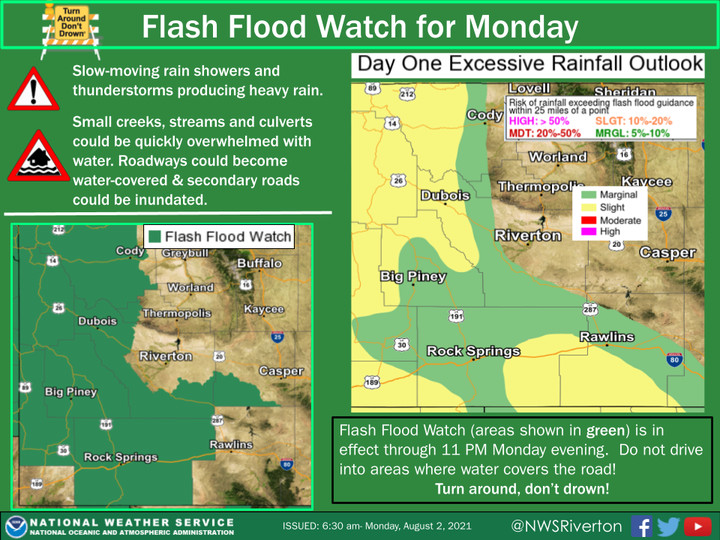 According to the NWS Riverton office, the Flash Flood Watch will include portions of Sweetwater, Sublette and Lincoln counties. Cities included in this warning are Rock Springs, Green River, Big Piney, Kemmerer, South Pass, Atlantic City, and Jeffrey City.