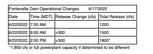 Releases from Fontenelle Dam are scheduled to be increased from 1,200 cfs to 1,800 cfs on Wednesday, June 22.