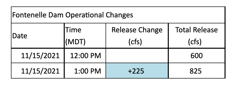LA BARGE — The Bureau of Reclamation announced this week that the Fontenelle Dam water releases are scheduled to increase on November 15 from 600 cfs to 825 cfs.