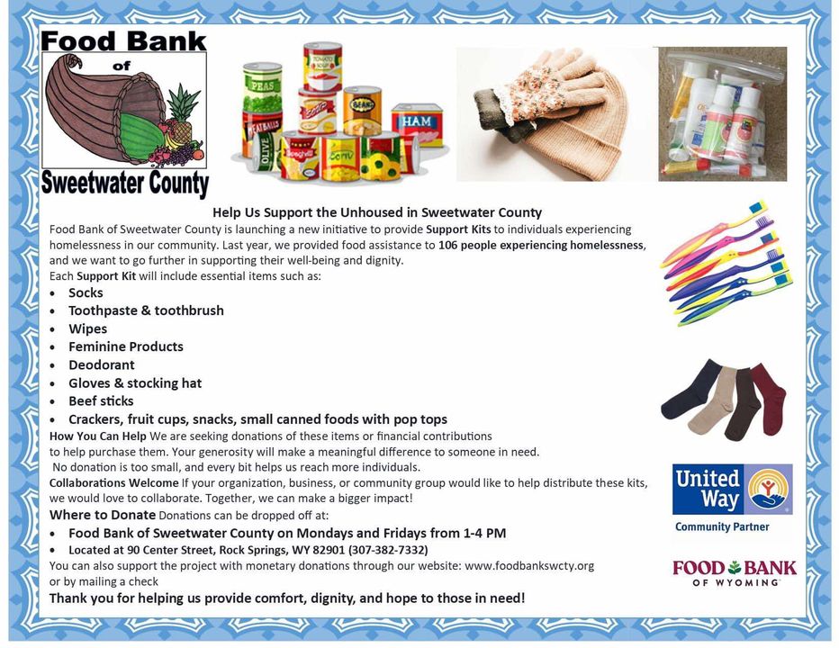 Additionally, the food bank is seeking items that will help support the unhoused individuals in Sweetwater County to put together support kits. These kits include essential items such as socks, toothpaste and a toothbrush, wipes, feminine products, deodorant, gloves and a stocking hat, and various food items. For more information, see the graphic below.