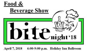 This night of bites is Saturday, April 7, 2018, from 6 – 9 pm at the Holiday Inn Ballroom.