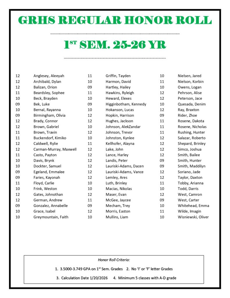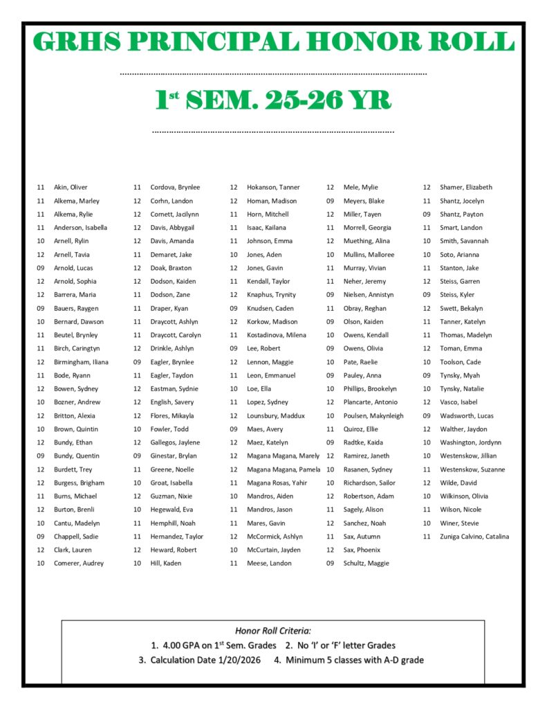 GREEN RIVER — Green River High School released its fall 2025 honor roll lists, highlighting a number of dedicated students at GRHS.