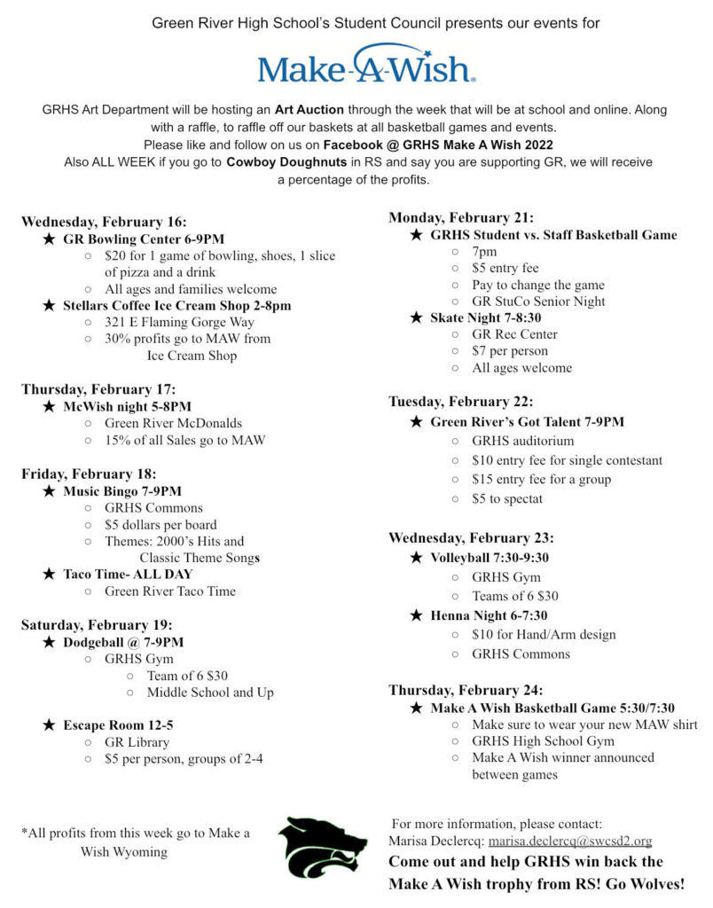 GREEN RIVER — Make-A-Wish has officially kicks off and next Wednesday, February 16, and Green River High School (GRHS) has put together some great events to help raise funds and grant some wishes.