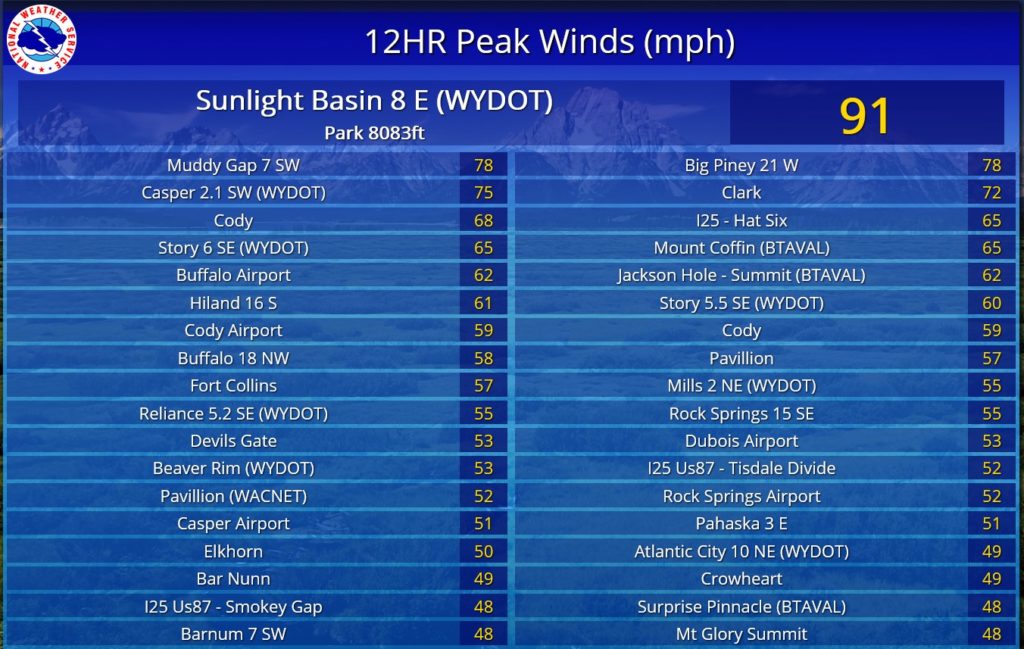 Muddy Gap and Big Piney both reported a 78 mph gust, while Sunlight Basin in Park County reported a gust at 91 mph.