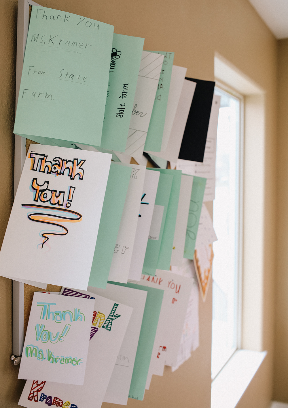 A bulliten board full of thank you cards displayed in the front of the office. This is Wendy. Everybody loves Wendy!