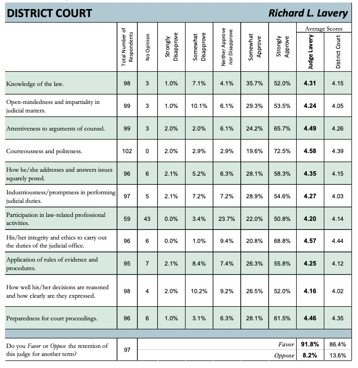 Judge Lavery received high scores in the survey for his courteousness in court, case preparation, and attentiveness to arguments of council.