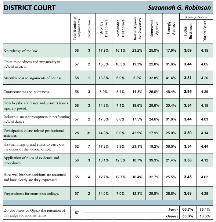 Overall, Judge Robinson had a near 67 percent favorability rating for retention to the bench by the WBA.