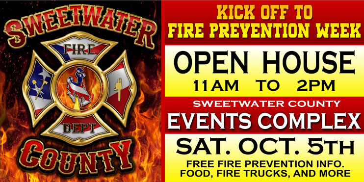 All the Fire Departments within Sweetwater County will be hosting a, “Kick Off to Fire Prevention Week, Open House” for the residents of Sweetwater County. The Open House will have apparatus and firefighters from all of the Fire Departments within Sweetwater County along with very Special Guests who will be serving FREE hot dogs and drinks on Saturday, October 6th starting at 11am until 2pm at the Sweetwater Events Complex.