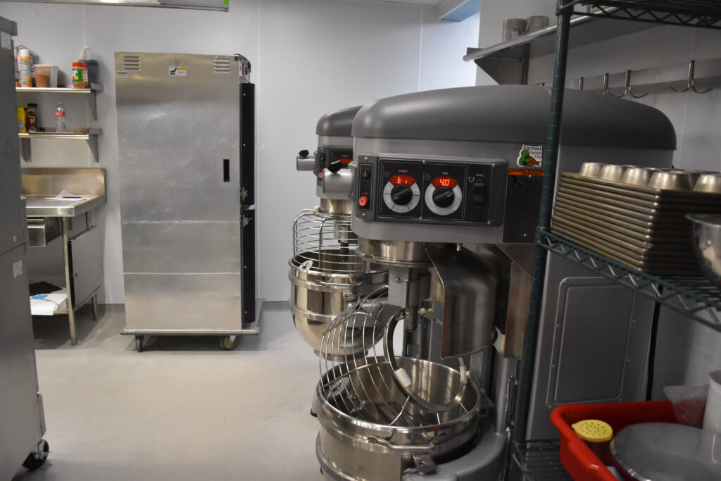 The kitchen is equipped with three 60-quart mixers, as well as a smaller 20-quart mixer, which replaced the original mixers that were all 50 years old.