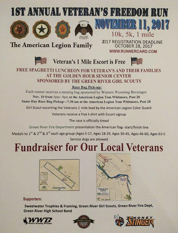 GREEN RIVER—The American Legion Tom Whitmore Post 28 will be hosting its First Annual Veteran’s Freedom Run, a fundraiser for local Veterans, on Saturday, November 11, starting at 8 am.