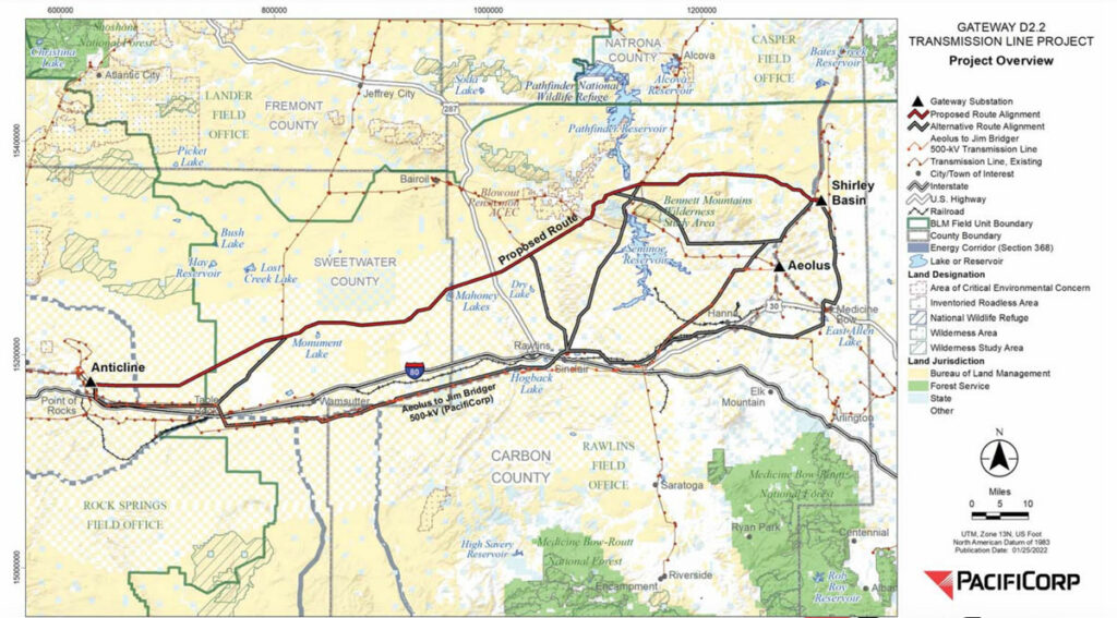 Gateway D2.2 is a proposed new 500 kilovolt AC transmission line approximately 143 miles from the Shirley Basin Substation to the Anticline Substation. The project will “deliver up to 1,100 megawatts (MW) of additional wind energy,” documents state.
