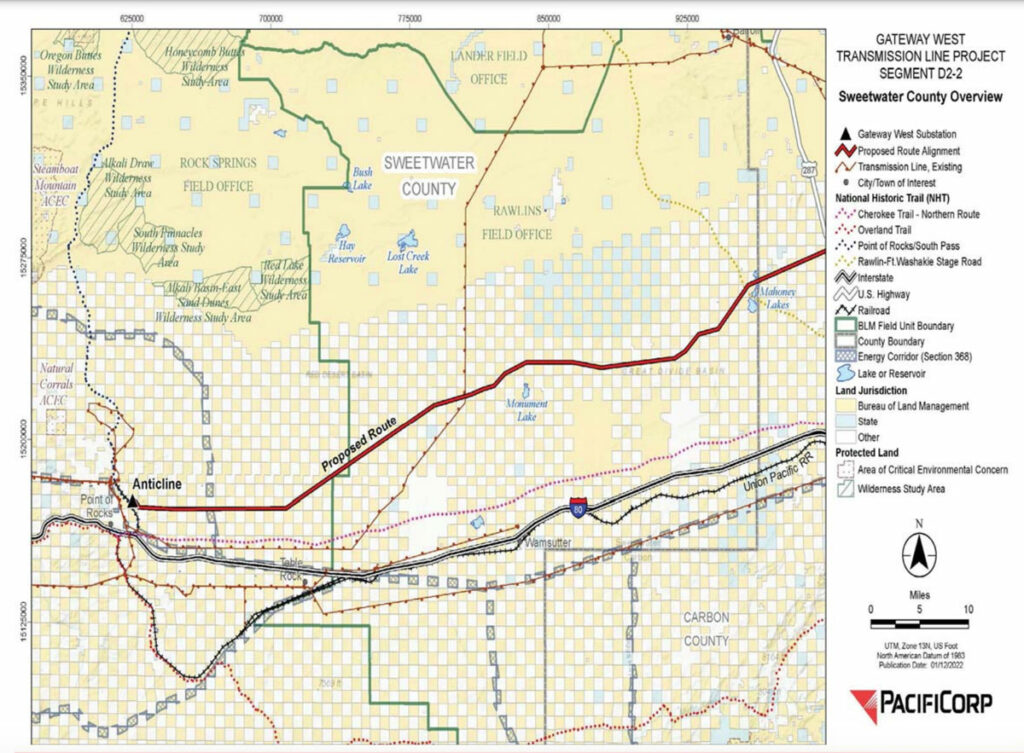 Approximately 69 miles of the transmission line will be in Sweetwater County, with 33 miles on Bureau of Land Management land and 36 miles on private land.