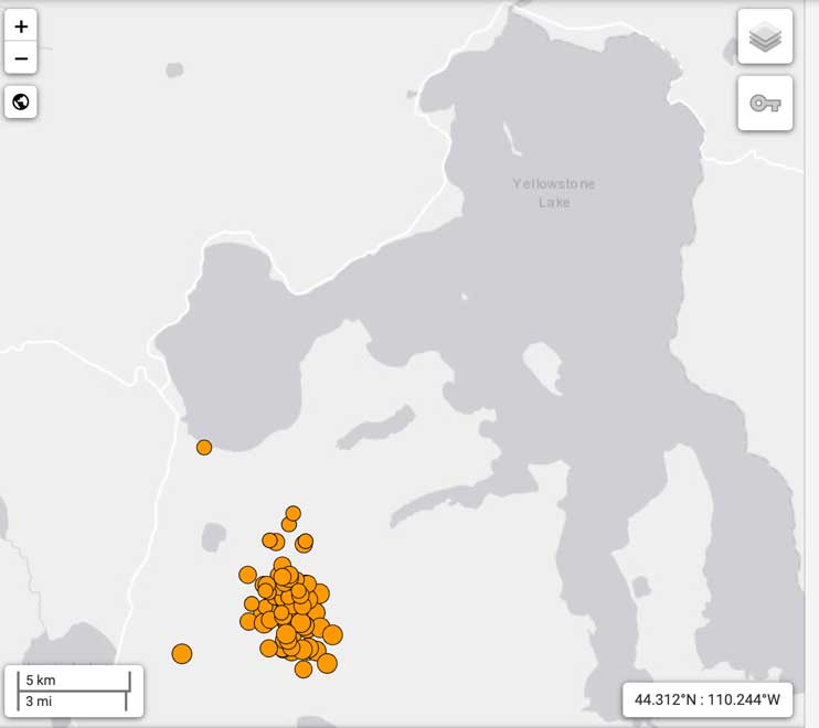 Today’s seismic activity is a little abnormal in that as of 4 pm Thursday, 93 earthquakes, and counting, have occurred all within this area of Yellowstone Lake since Wednesday night, according to USGS data. All but seven of the earthquakes have been under 2.5 magnitude. None have reached 3.0 magnitude.