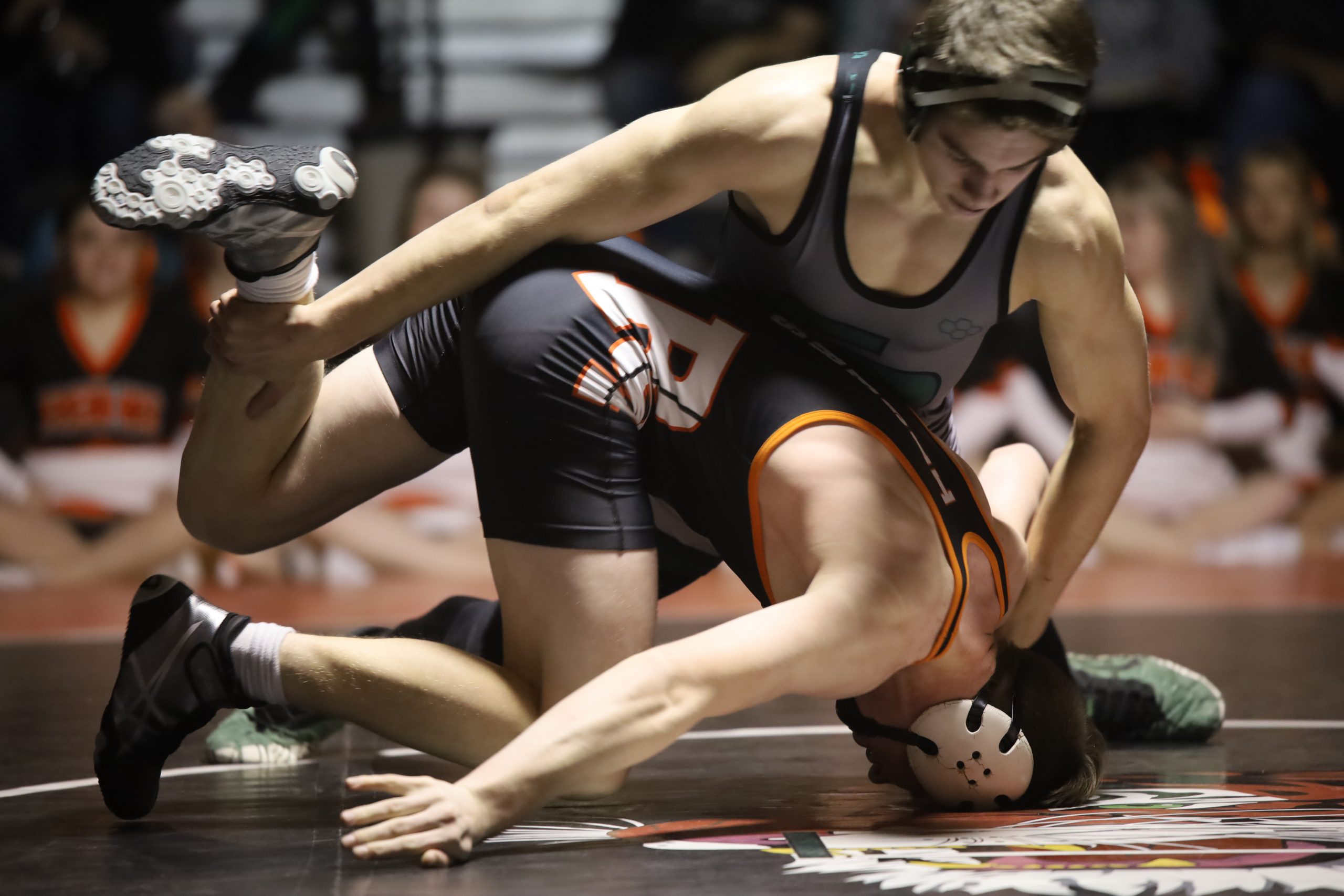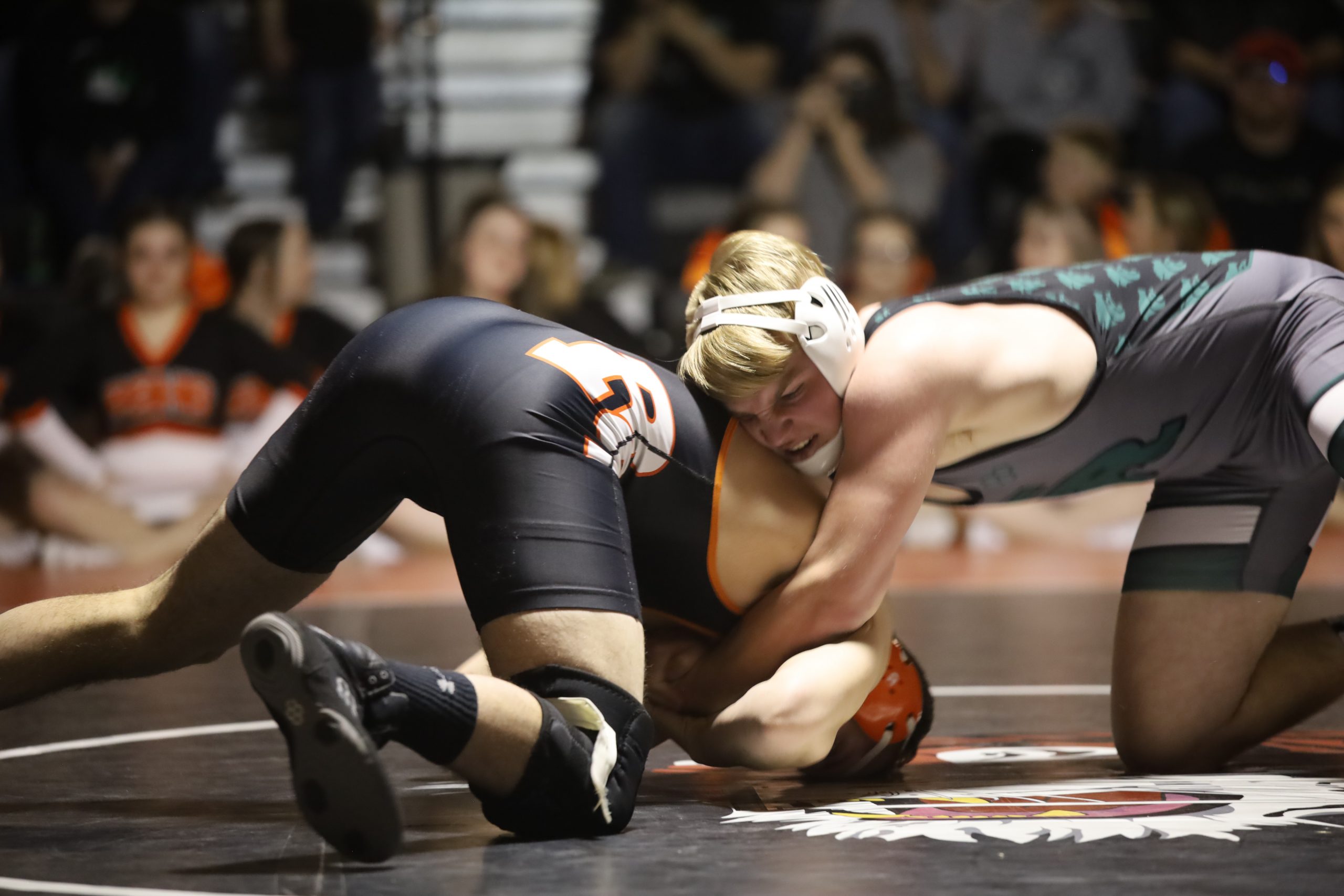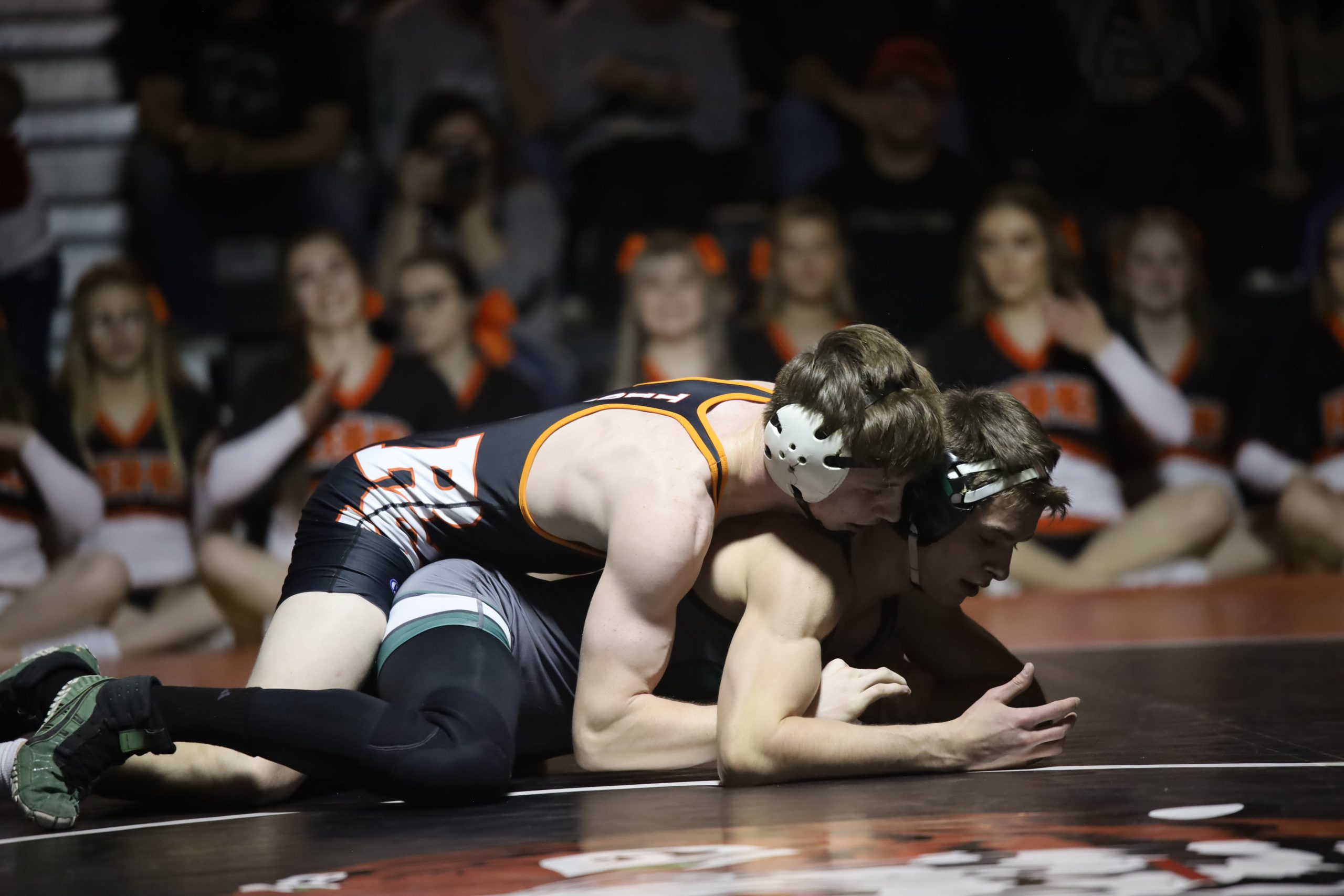 The first pin of the night came from GRHS’ Jon Ty Leininger who battled his way for a second period fall at the 3:39 mark to post six more points in favor of the Wolves.