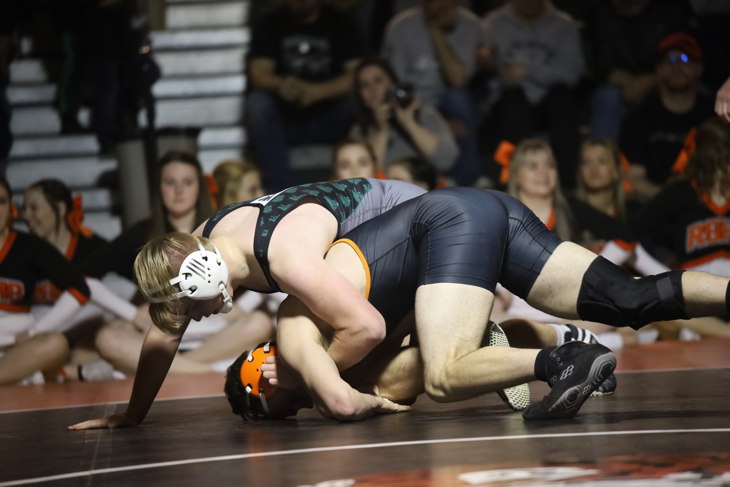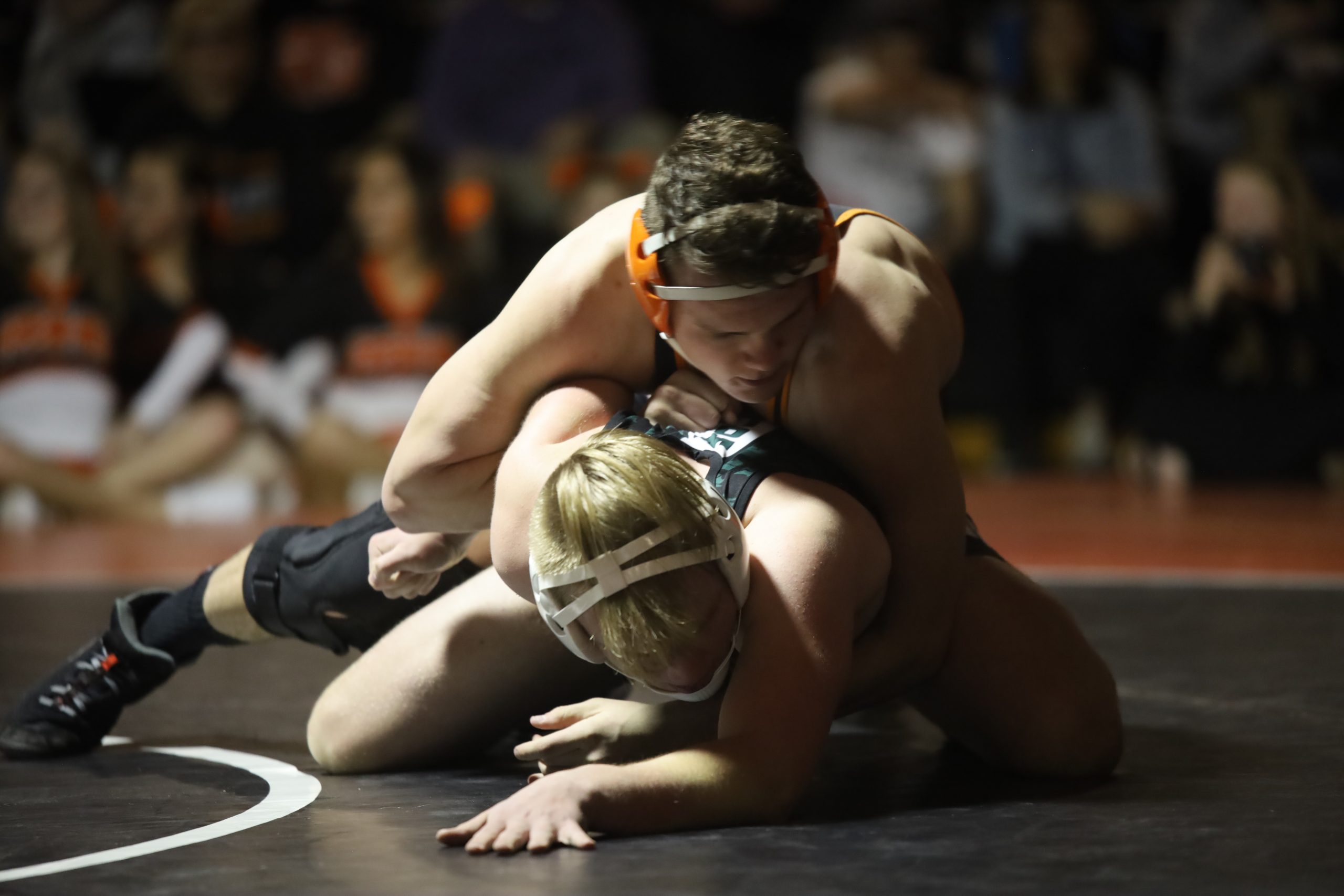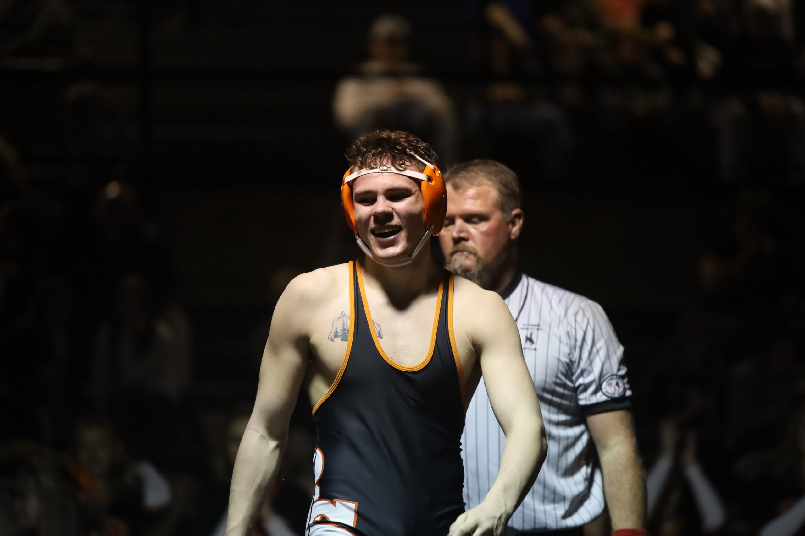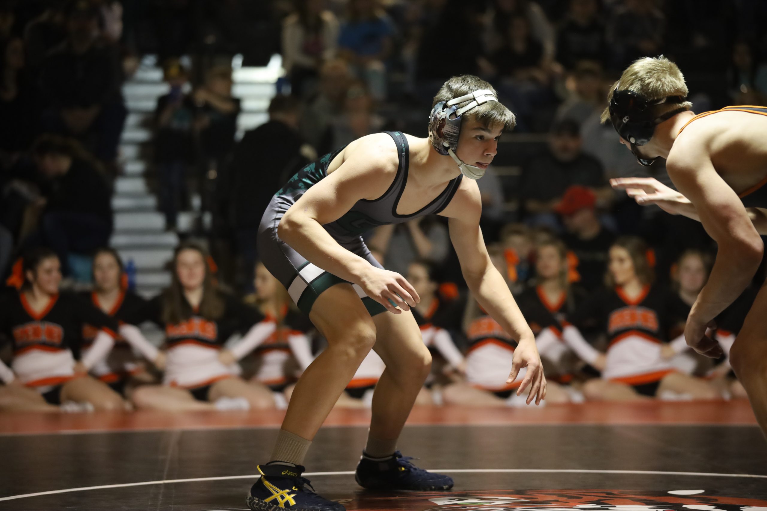 The first pin of the night came from GRHS’ Jon Ty Leininger who battled his way for a second period fall at the 3:39 mark to post six more points in favor of the Wolves.