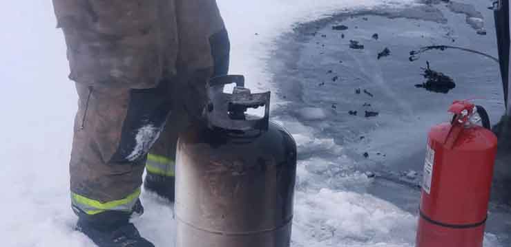 The fire occurred on Sulphur Creek, which is about 6.5 miles from Evanston. The fire started when a propane heater was too close to the side, the post states. In order to put the fire out, firefighters pulled quite of bit of hose from the shoreline to reach the fire.