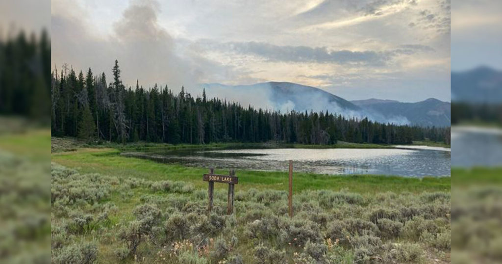 The Soda Lake fire is actively burning in a mixture of subalpine forest, sage, and meadows just south of Soda Lake in the South Cottonwood Creek drainage. This area is approximately three miles from the forest boundary near Bureau of Land Management, state, and private land.