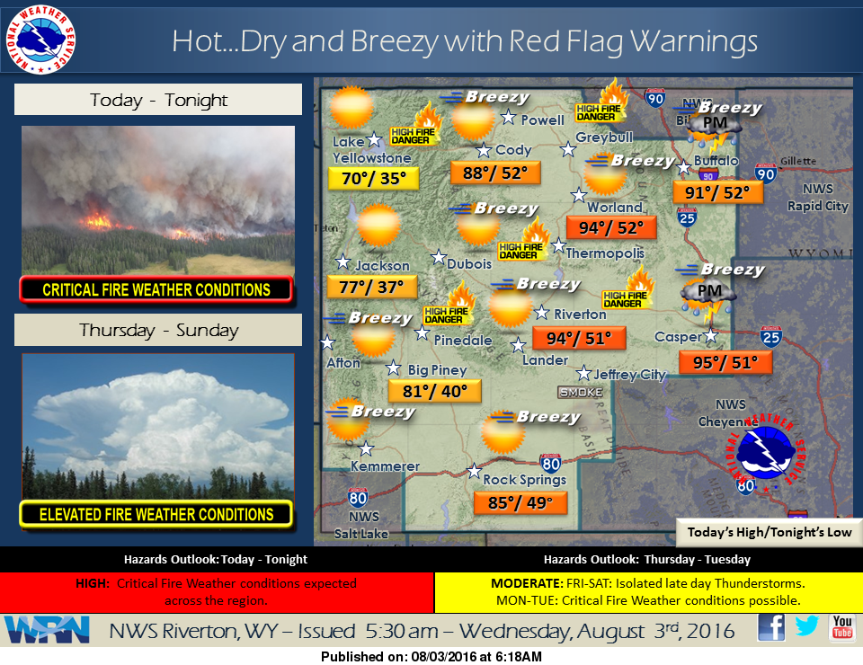 Isolated showers and thunderstorms. Some of the storms could produce gusty winds. Mostly sunny, with a high near 87. Breezy, with a north wind 5 to 10 mph becoming west 12 to 17 mph in the afternoon. Winds could gust as high as 24 mph. Chance of precipitation is 20%.