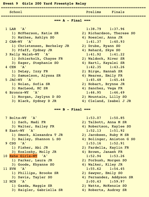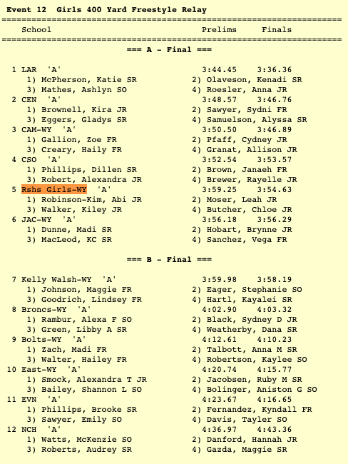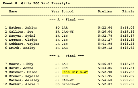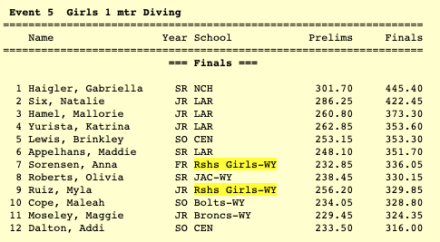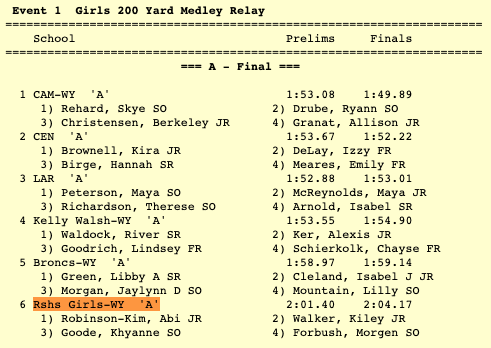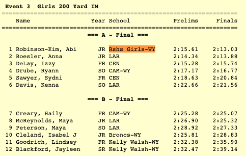 Rock Springs’ Abi Robinson-Kim went into the competition as the defending state champion in the 200 IM and 100 backstroke. Robinson-Kim successfully defended her 200 IM title, winning it again, while finishing third in the 100 backstroke on Friday.
