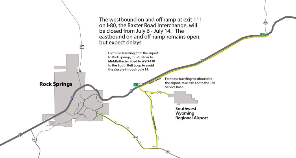During this time, those traveling from the airport back to Rock Springs will have to detour to Baxter Road and then to the Rock Springs belt loop. Traffic traveling westbound to the airport or Middle Baxter Road will have to detour on Exit 122 or travel to Rock Springs and circle back.
