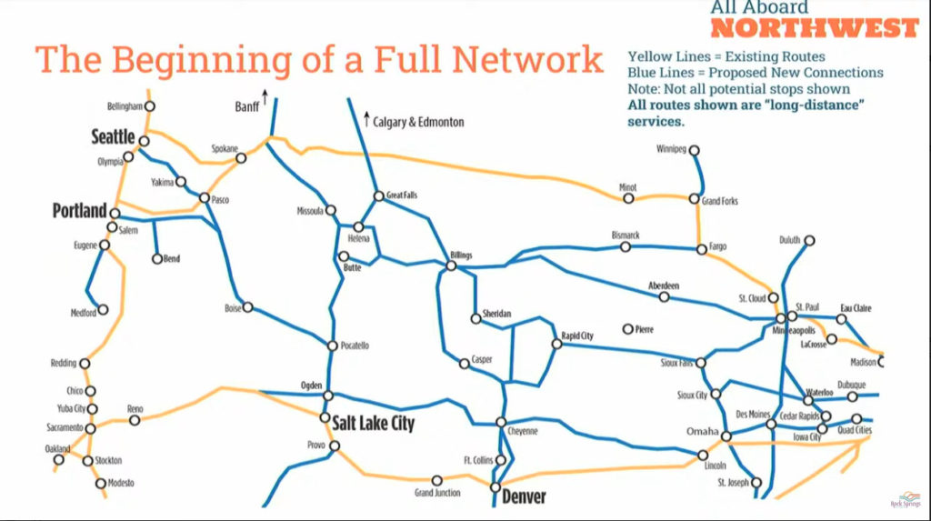 The following graph shows what they would like to see the full regional greater Northwest rail system would look like. The yellow lines show the existing Amtrak routes, such as the Empire Builder. The blue lines are the new connections for the rail service.